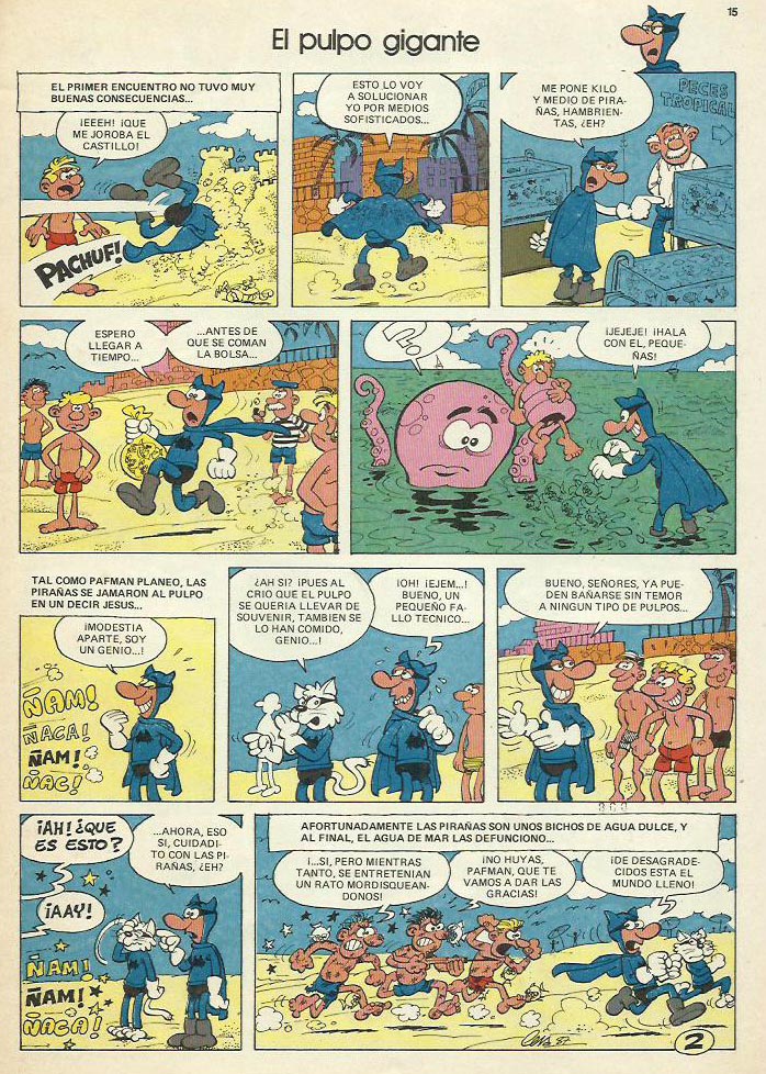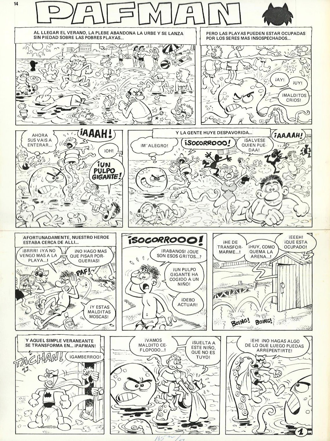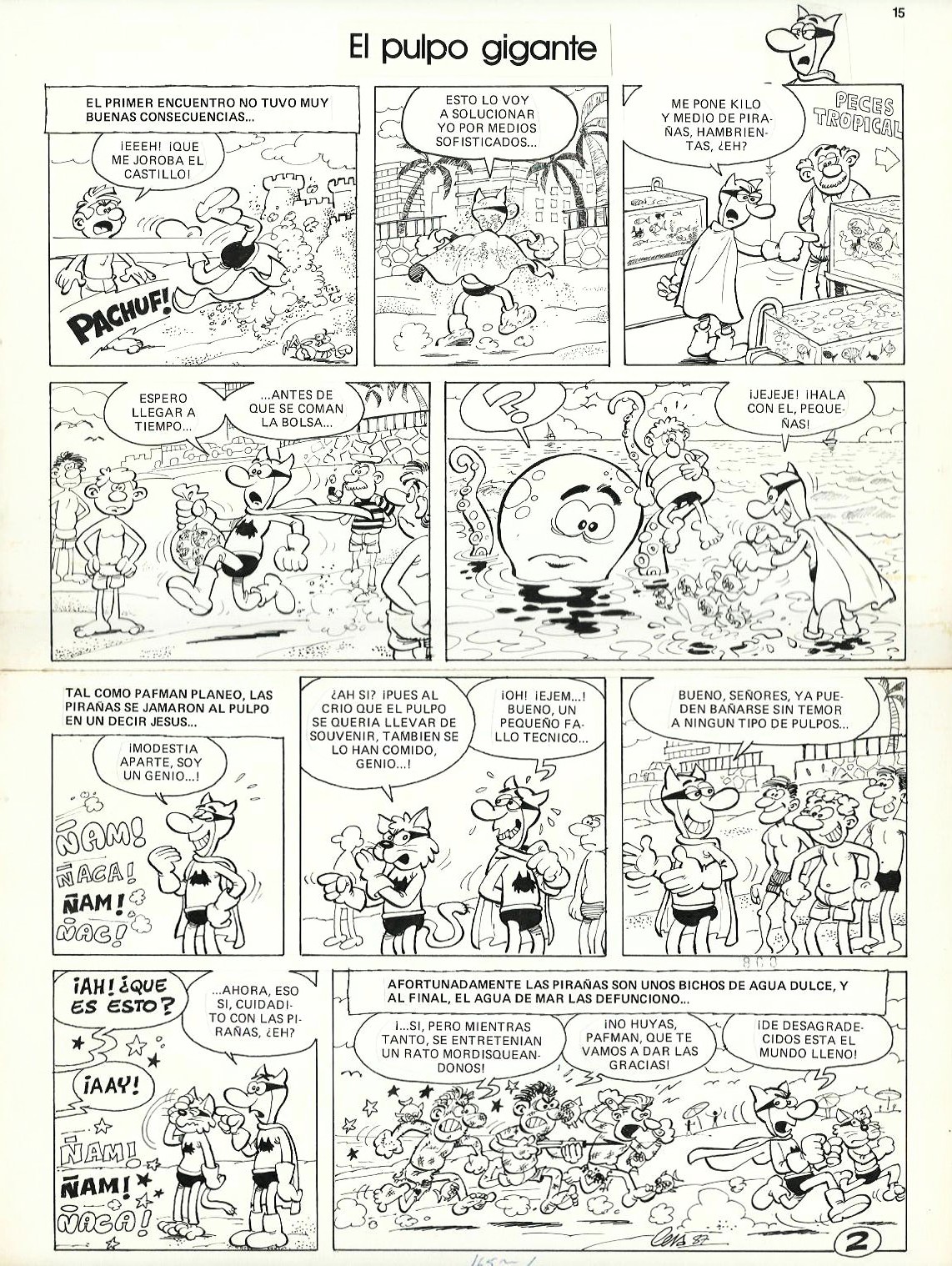 Genre: 2 original Pafman pages (complete) – First comics – Published in Mortadelo #9 (1987). The first originals in this series were done in two parts, which the author then joined together with tape at the back.